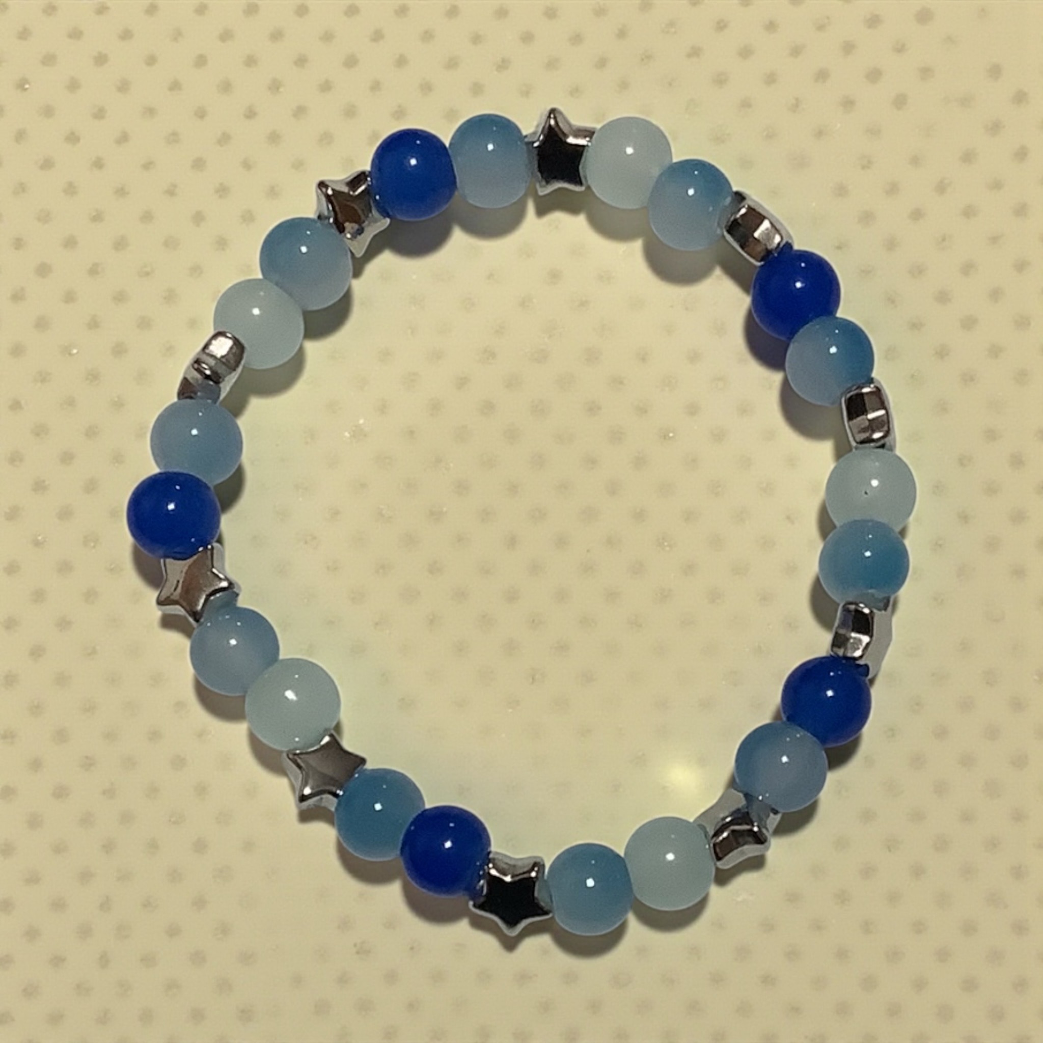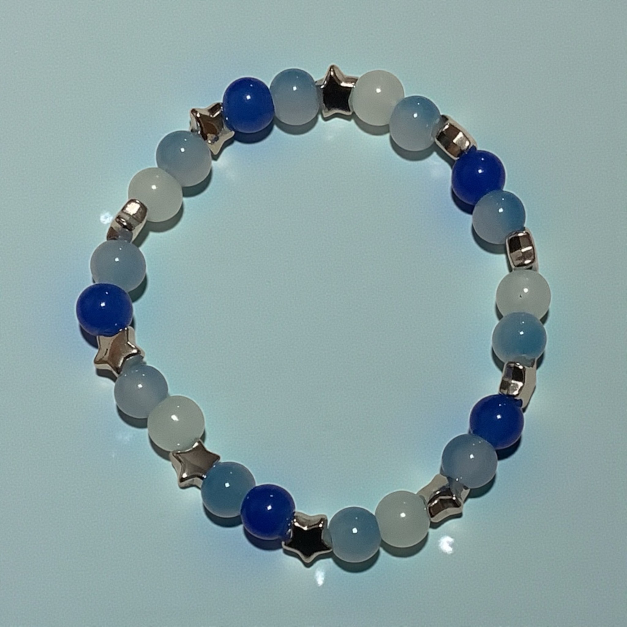 Cool blue and icy tones shine bright with silver star accents. This bracelet feels bold, bright, and ready to stand out.
