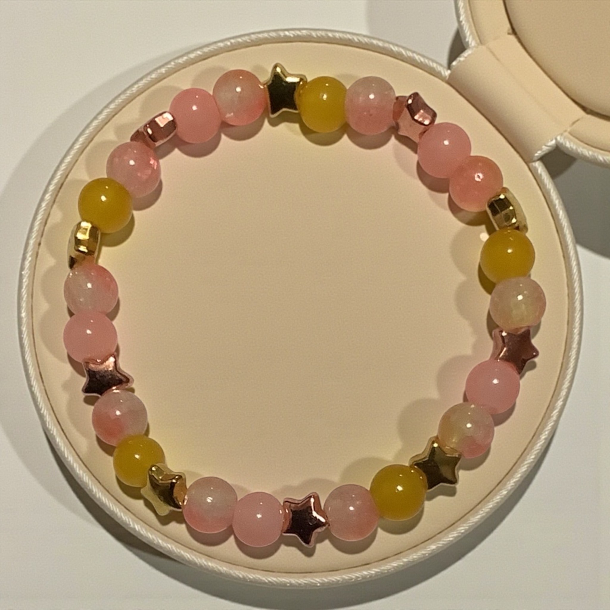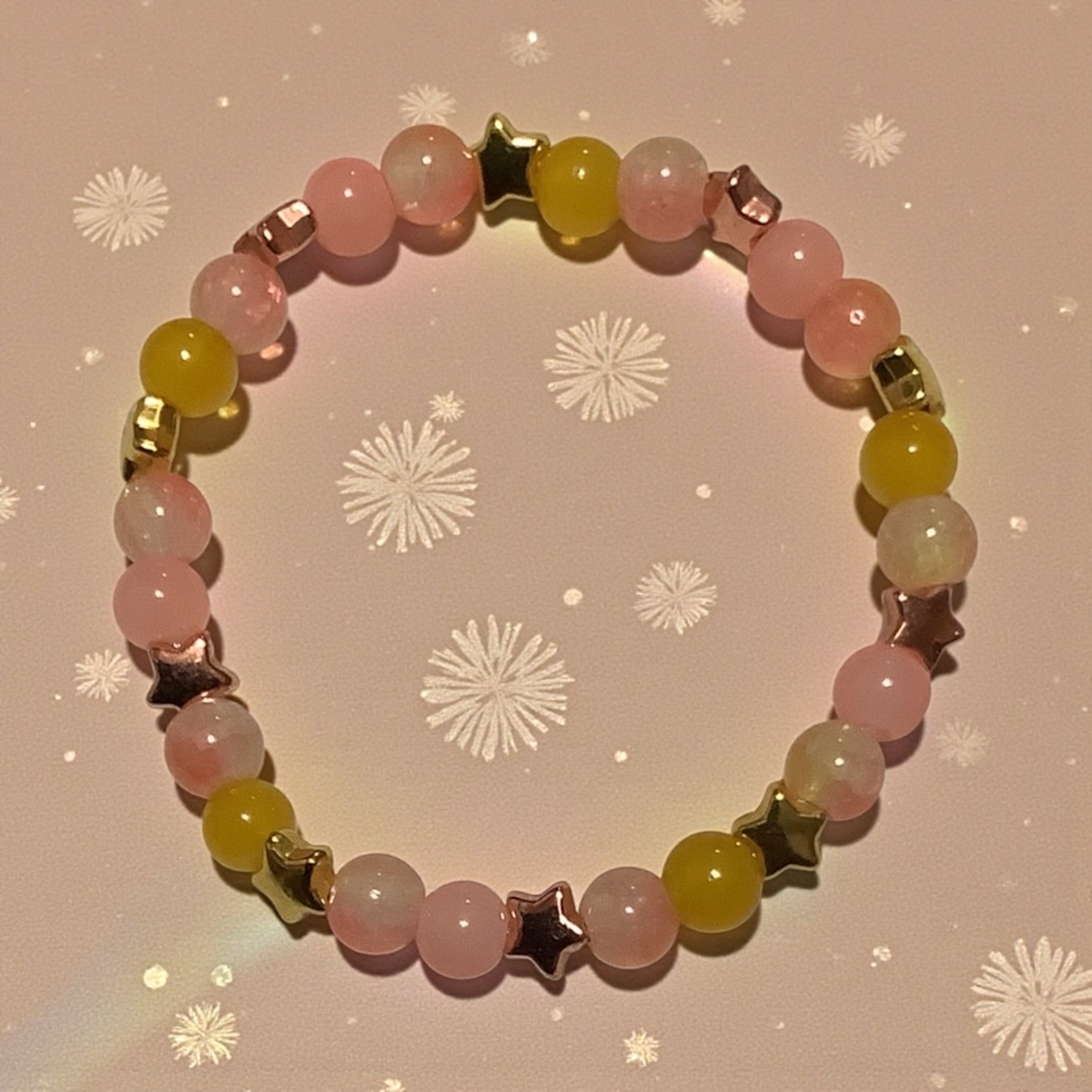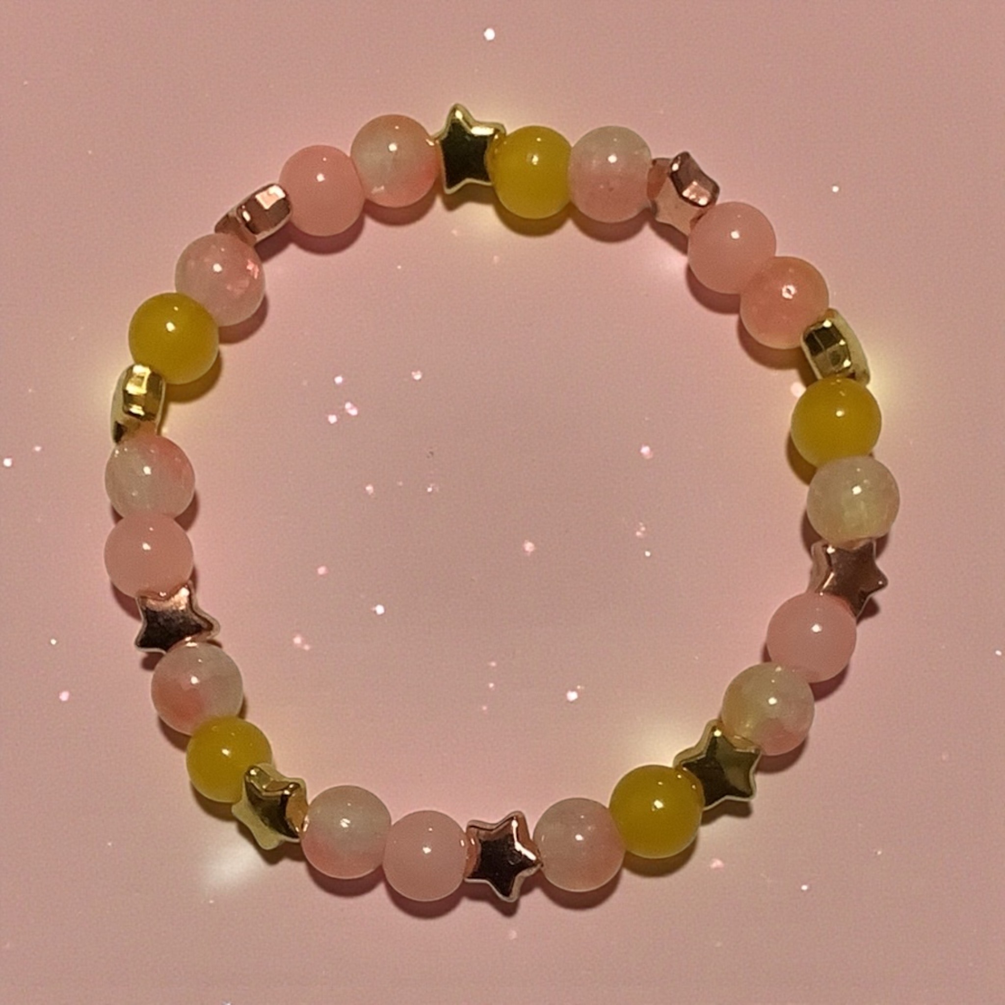 Soft baby pink beads sparkle between golden stars for a bracelet that feels delicate, sweet, and timeless. Perfect for everyday shine.