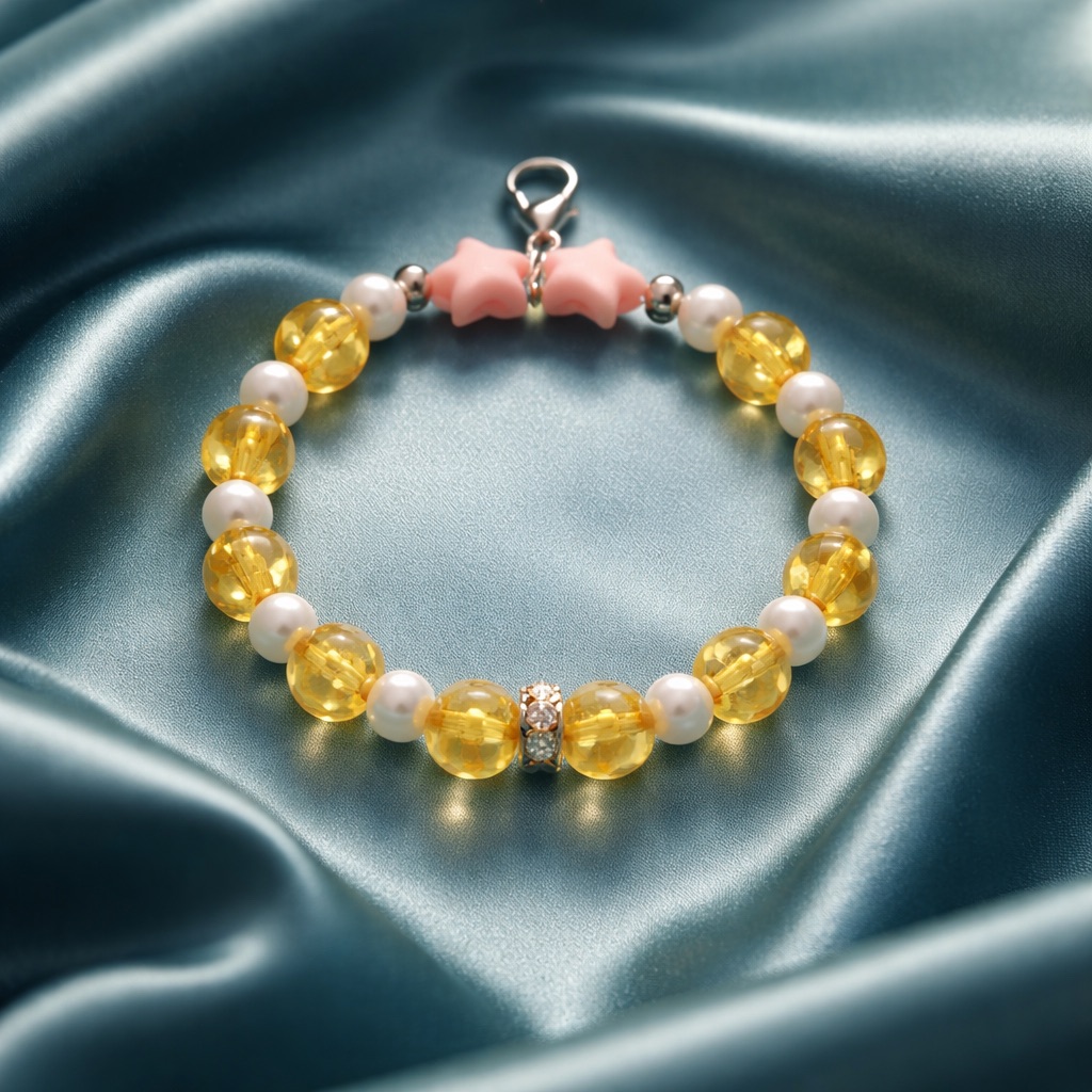 Warm, golden, and glowing like sunshine ✨ The Golden Honey Drop Keychain features radiant honey-toned sparkle beads paired with glossy pearls and a soft pastel star accent. Sweet and stylish, it’s the perfect accessory to brighten backpacks, purses, and key sets.