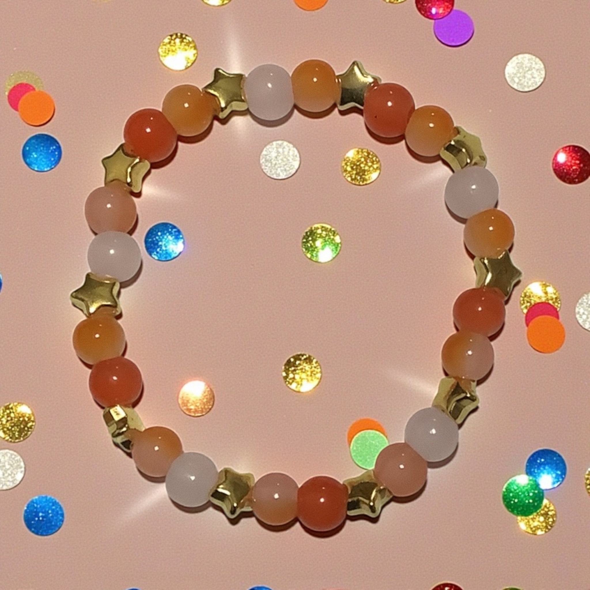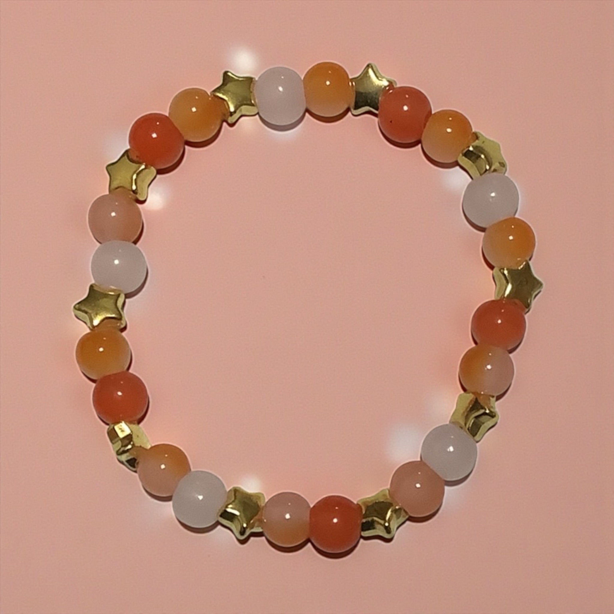 Soft peach and warm sunset tones paired with golden star accents make this bracelet shine like the sweetest evening sky. Playful, dreamy, and full of sparkle — perfect for minis who love a soft glow look.