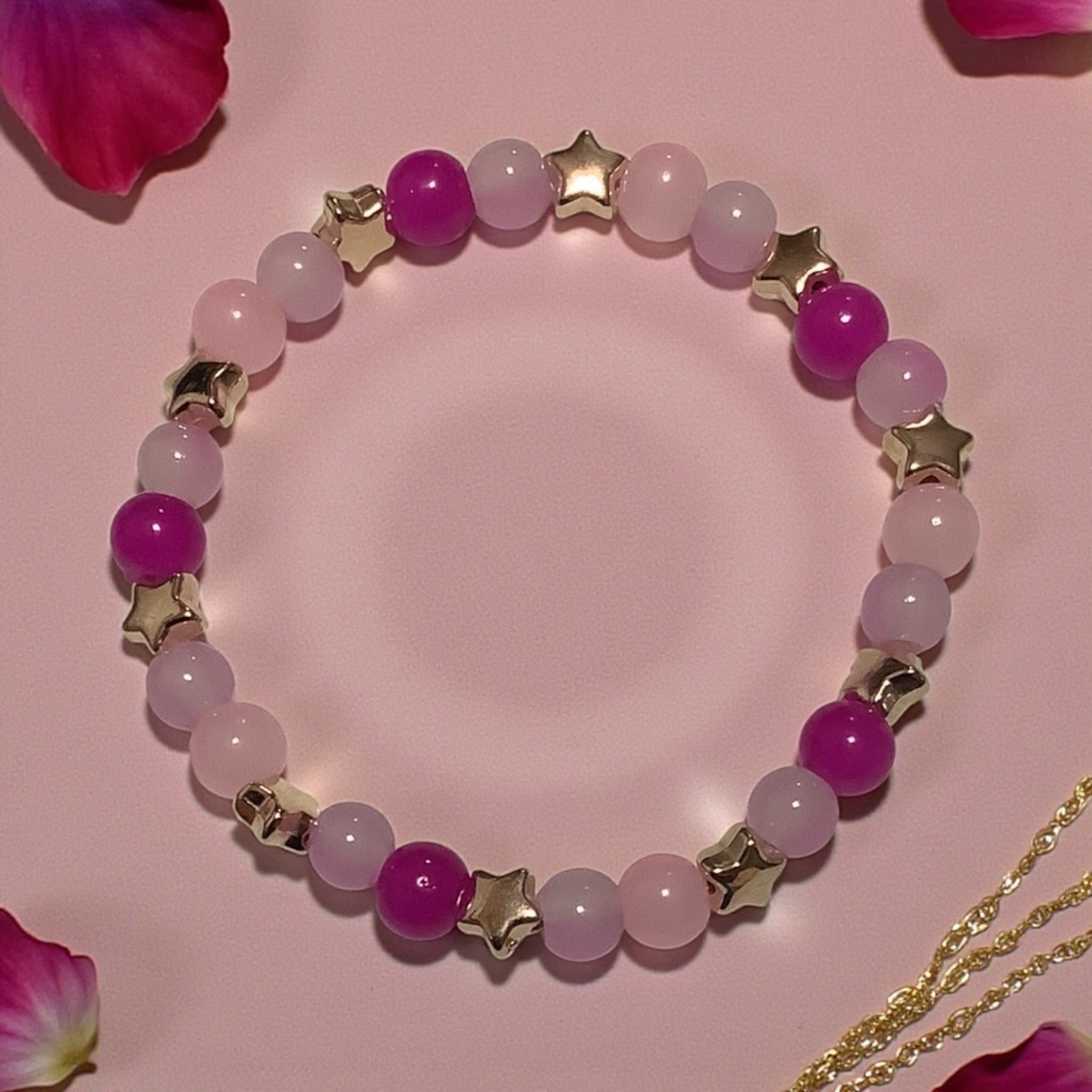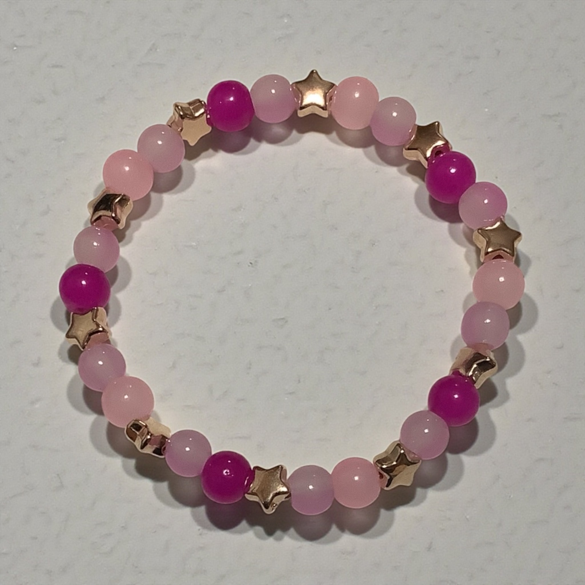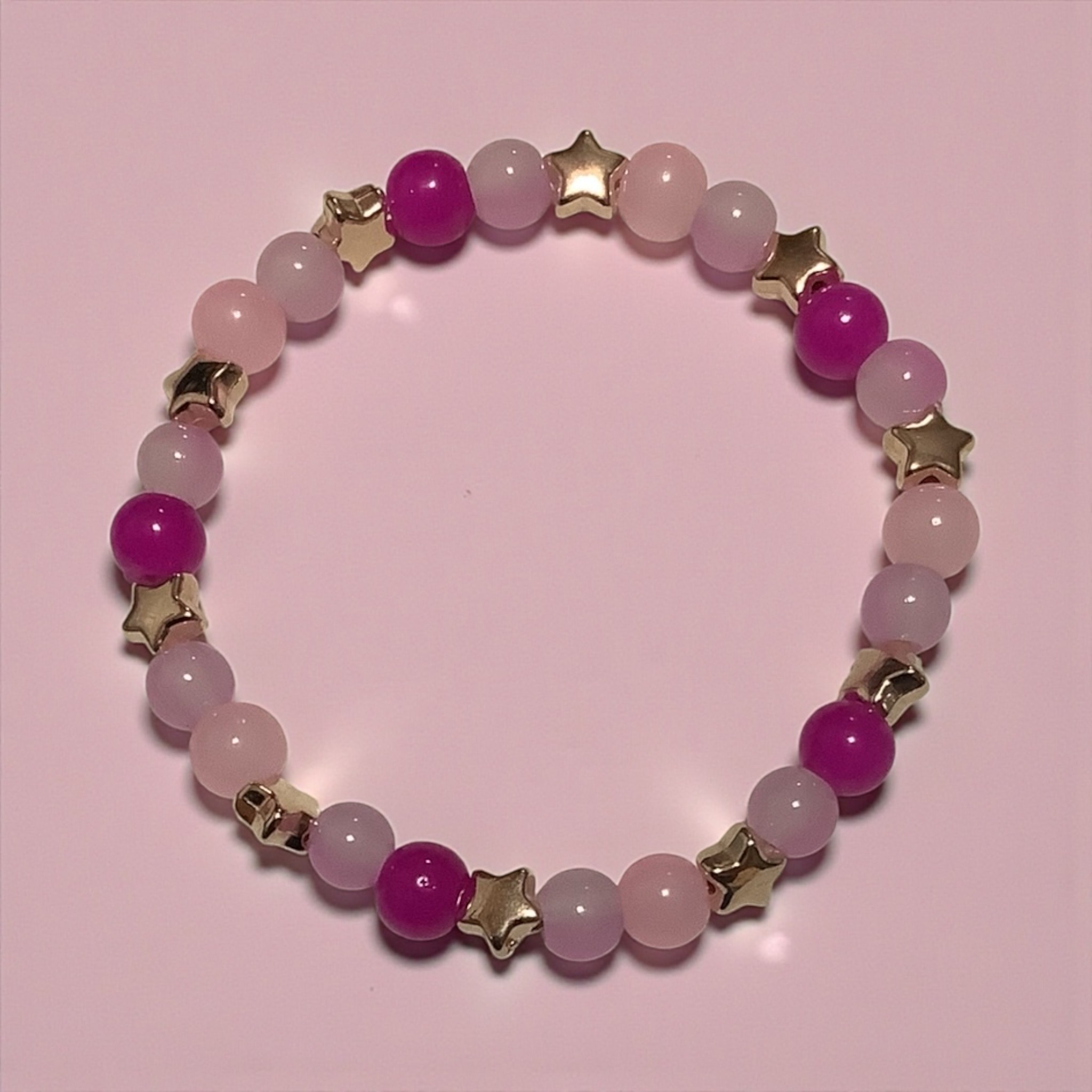 Light pink and vibrant magenta beads swirl together like a cotton candy galaxy. Finished with golden stars, this bracelet is sweet, sparkly, and full of fun.