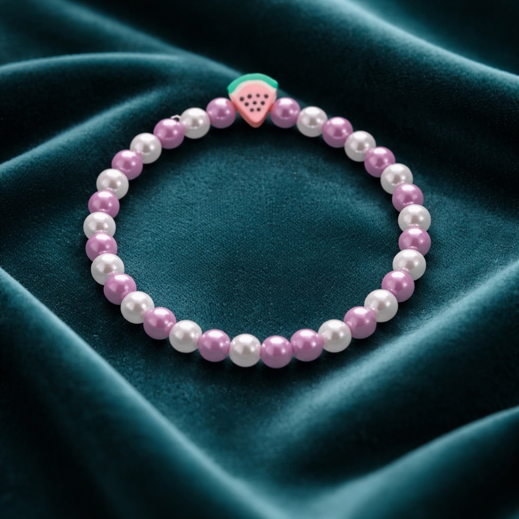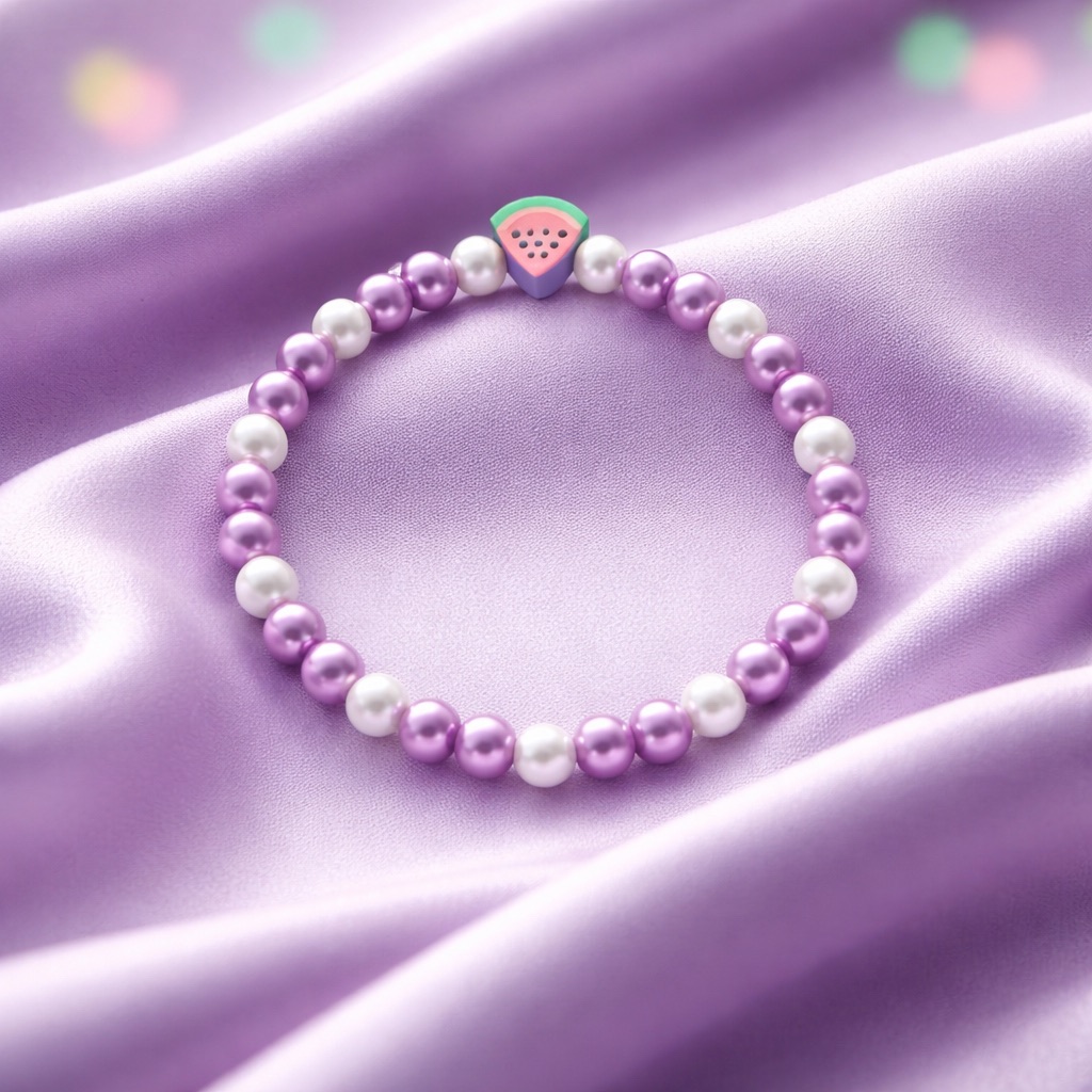 Soft, sweet, and full of sparkle 💜✨ The Plum Melon Mist Bracelet blends glossy plum beads with classic pearls for a dreamy, elegant look. Finished with a charming watermelon slice detail, this bracelet brings a playful fruity twist to a soft pastel glow.