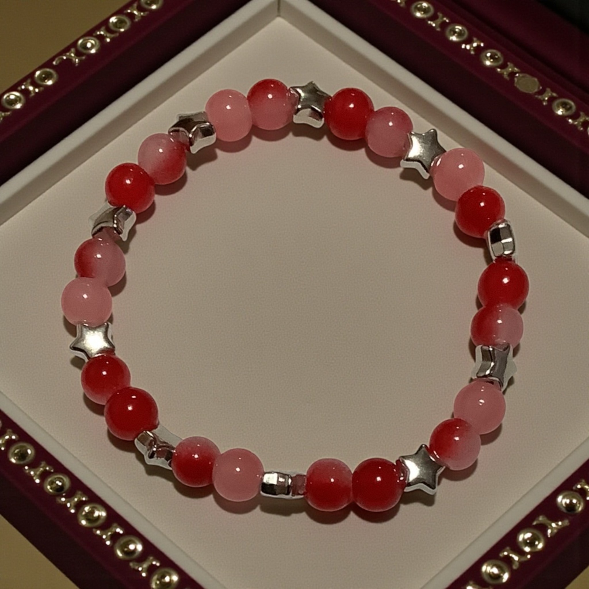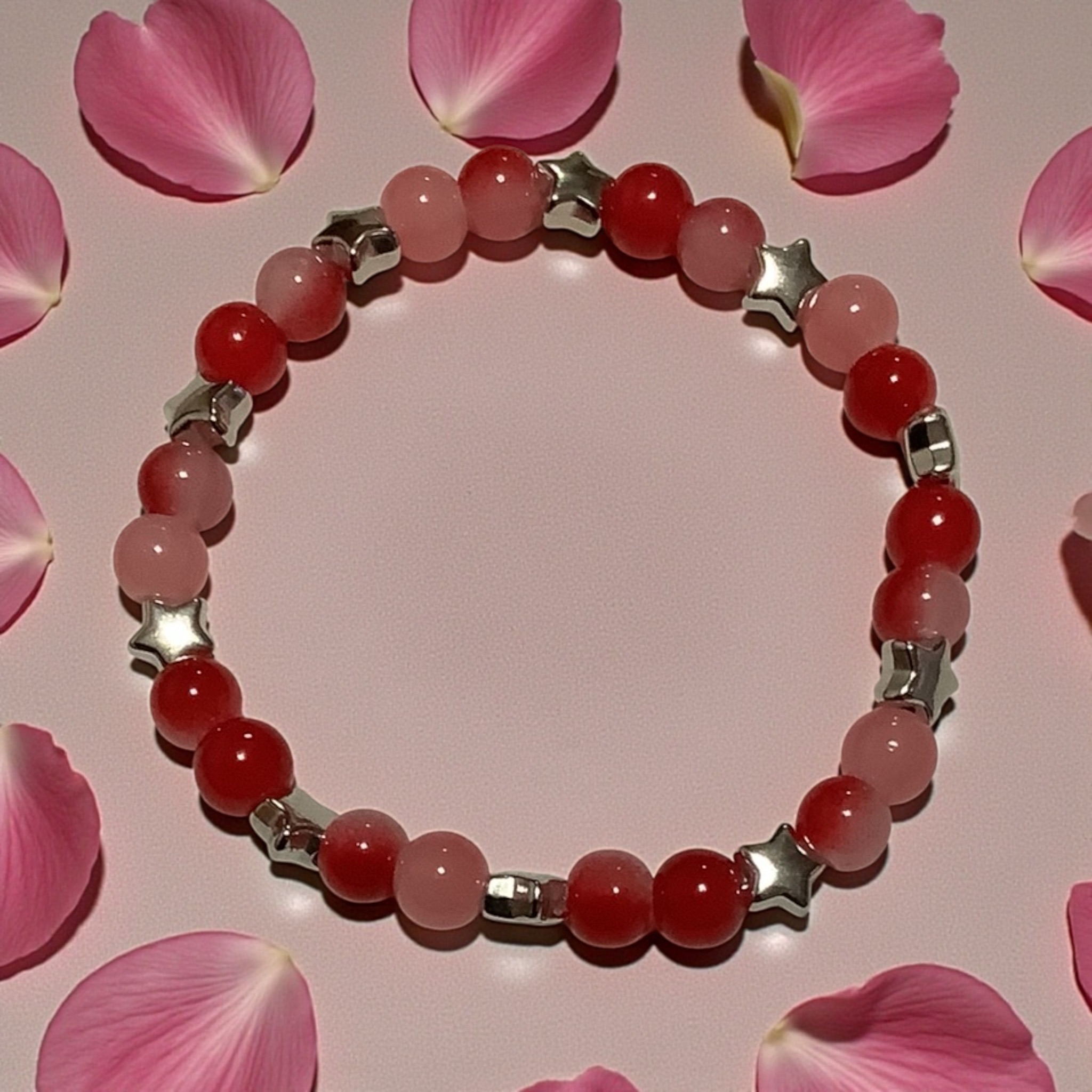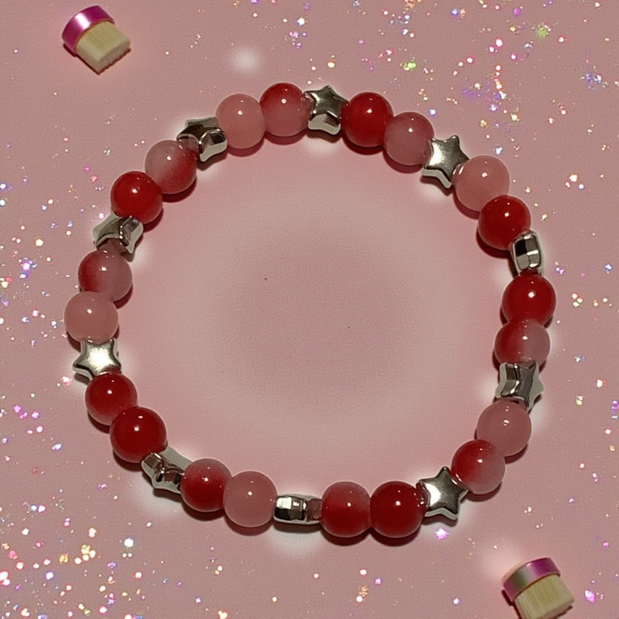 Bold red tones meet soft blush beads and shimmering stars for a bracelet that feels confident and bright. A little dramatic, a lot adorable — made for shining personalities.